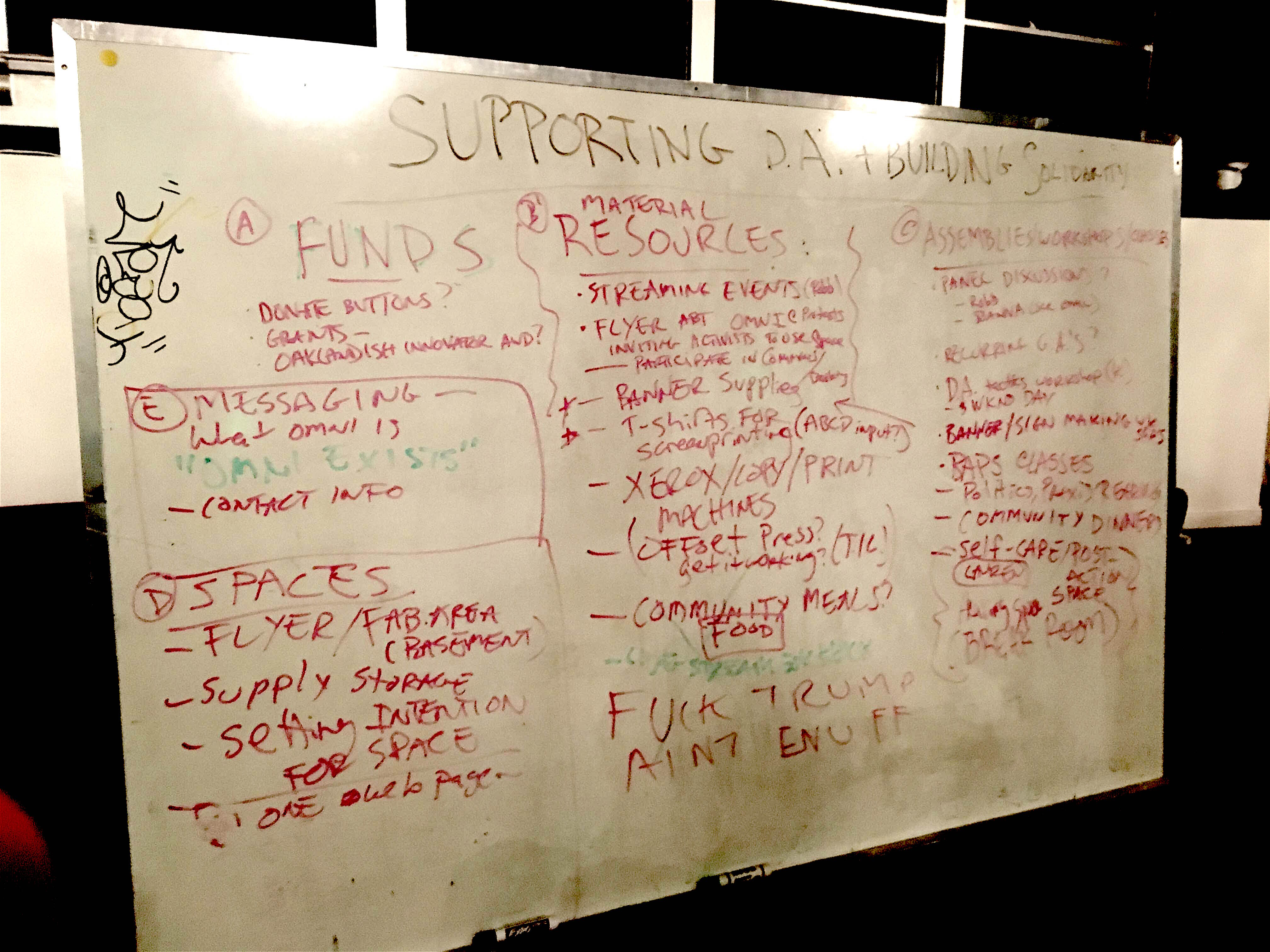 Whiteboard notes of the first 'organize' meeting on Weds Nov 10 2016.